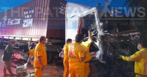 Sleepy truck driver breaks his leg in massive collision with another truck in Sri Racha